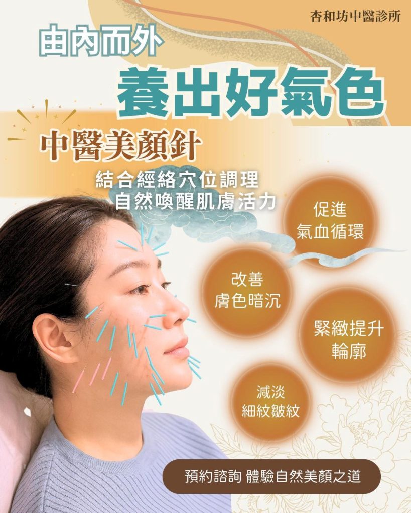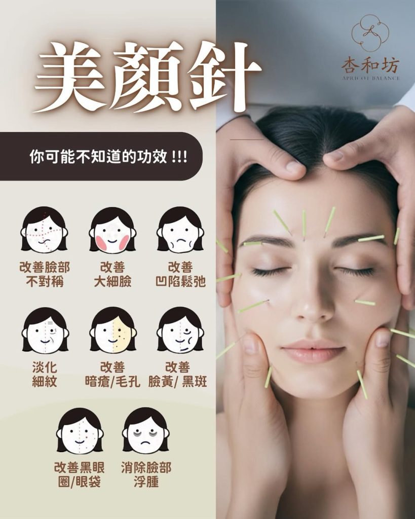 美顏針是一種結合中醫理論與西醫解剖學的美容療法,利用比頭髮還細的微針,刺激臉部皮層、肌肉和筋膜,以促進血液循環、增加膠原蛋白增生,達到改善臉部線條、淡化皺紋、緊緻拉提等效果。 這種療法也被用於治療顏面神經麻痺、偏頭痛和睡眠障礙等問題,且通常恢復期短,幾乎無副作用。