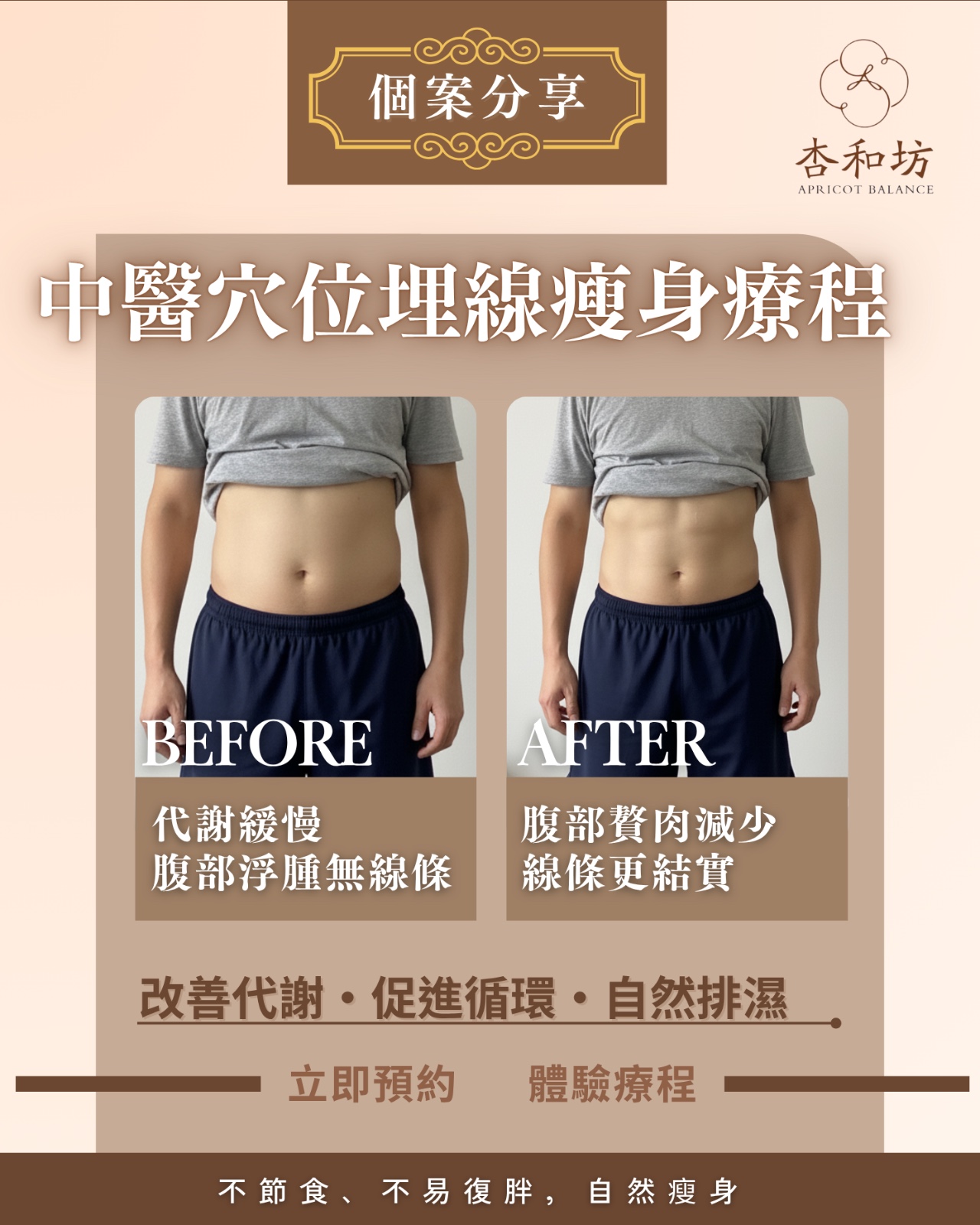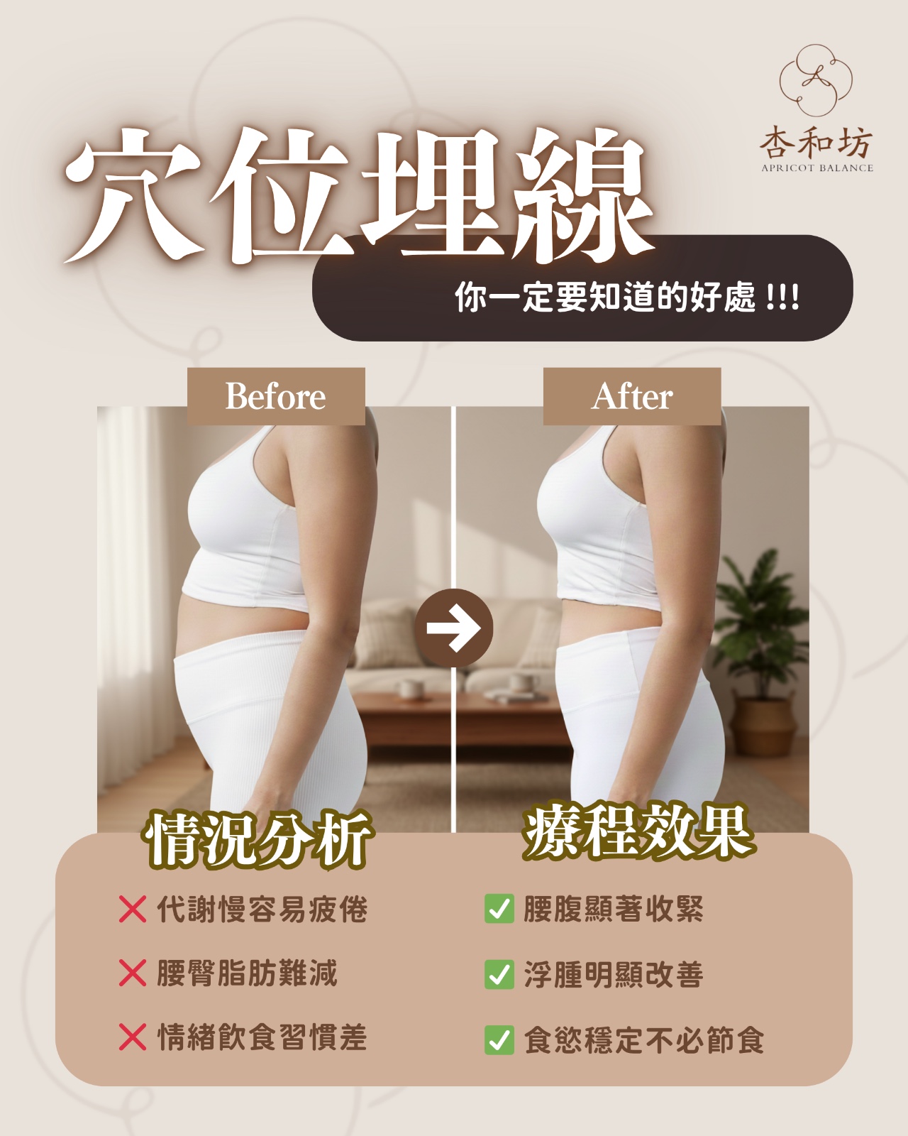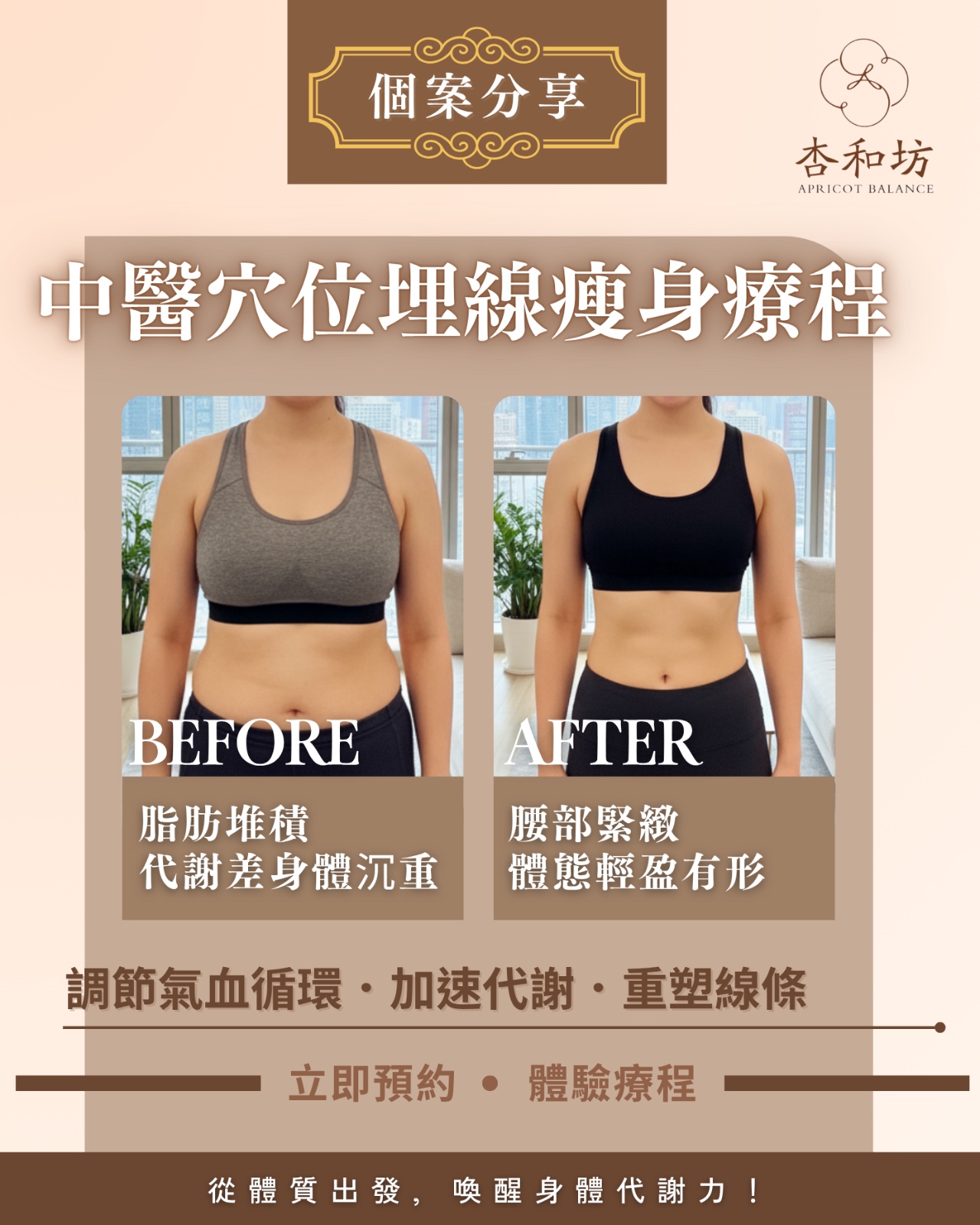 做咗三次穴位埋線之後,唔單止瘦返啲,連精神都好咗,感覺真係由內到外都調理返個身體,唔再係為減肥而減肥。」